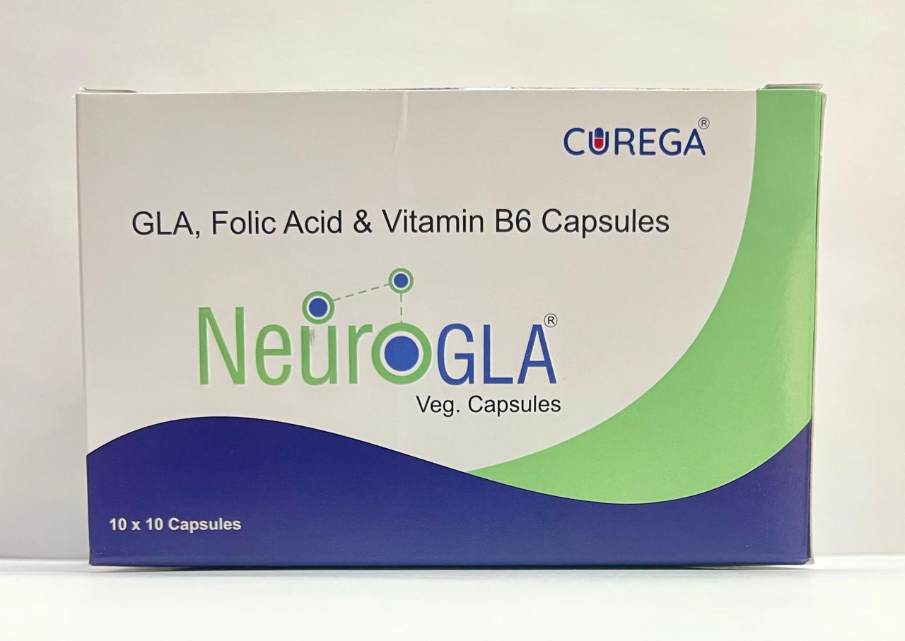 NeuroGLA Veg Capsules by Curega is a scientifically formulated nutritional supplement containing Gamma Linolenic Acid (GLA), Folic Acid, and Vitamin B6, designed to support nerve health and overall neurological well-being. This unique combination helps in maintaining healthy nerve function, reducing nerve discomfort, and supporting metabolic and cardiovascular health.